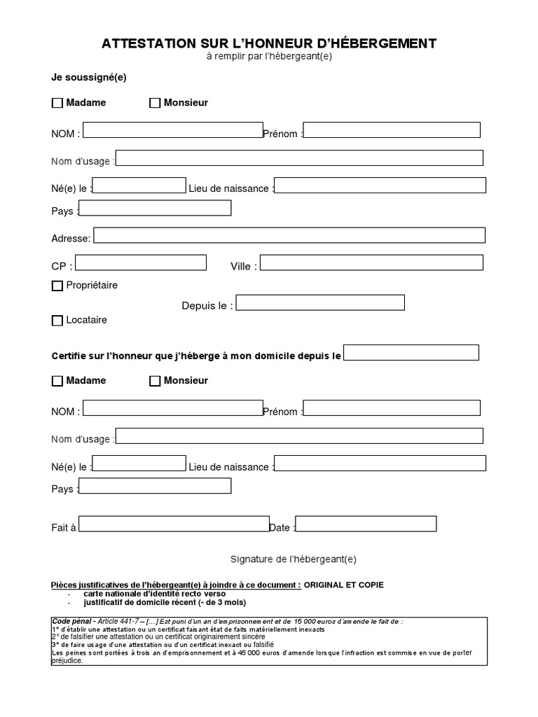Attestation D\'Hébergement : Le ministère chargé du logement a lancé une consultation citoyenne dans le cadre de la démarche « habiter la france de demain », jusqu'au 15 août 2021.. Nous vous proposons sur notre. Mme mlle (nom et prénom) , Attestation d'hébergement a compléter par l'hébergeant je soussigné(e) : Bien souvent, un modèle type de lettre est utilisé pour créer une attestation d'hébergement par exemple. Mme mlle (nom et prénom) demeurant (adresse) , à (cp, ville) certifie sur l'honneur que m.